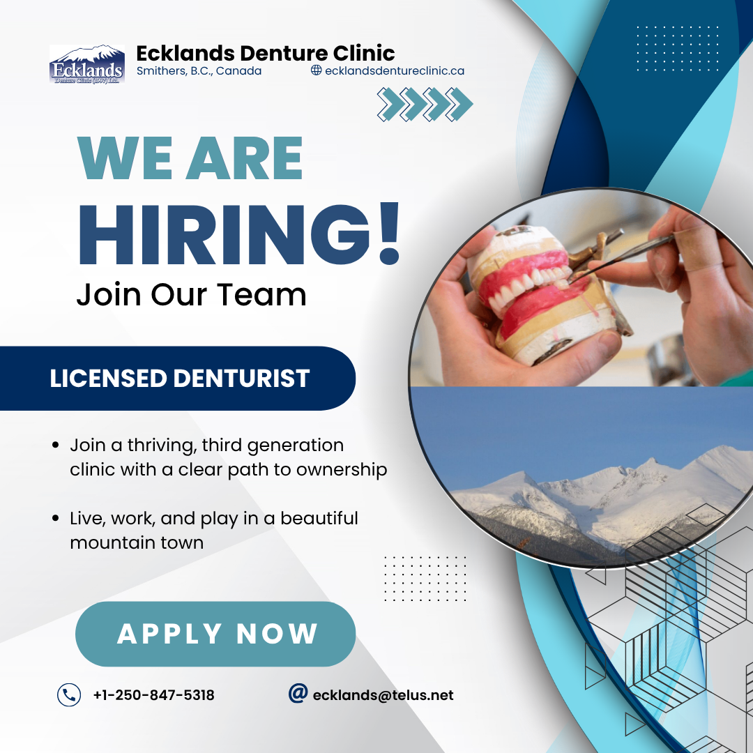 Ecklands Denture Clinic in beautiful Smithers, BC is looking for a passionate and skilled Denturist to join our third-generation clinic. This is a rare chance to step into a leadership role with a clear path to full-time ownership.